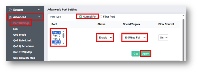 - Tại mục Port: Chọn cổng muốn chỉnh (Ví dụ: Port 1 và Port 4)