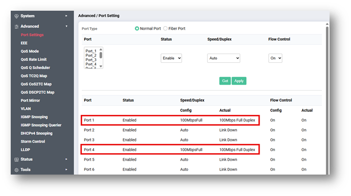Cổng mạng sẽ hoạt động theo tốc độ đã cấu hình. Có thể kiểm tra tốc độ thực tế tại cột “Actual” trong bảng trạng thái phía dưới.