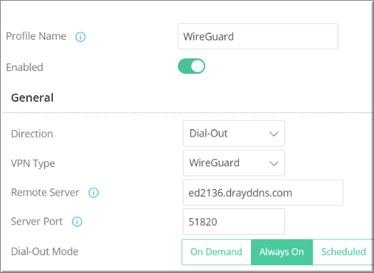 Key Pairs trong phần General Setup sẽ được gán cho Vigor Router. Các Client VPN WireGuard (peer) cần khai báo Server Public Key của Vigor Router để tạo profile WireGuard VPN. Sao chép Public Key của server WireGuard VPN để sử dụng