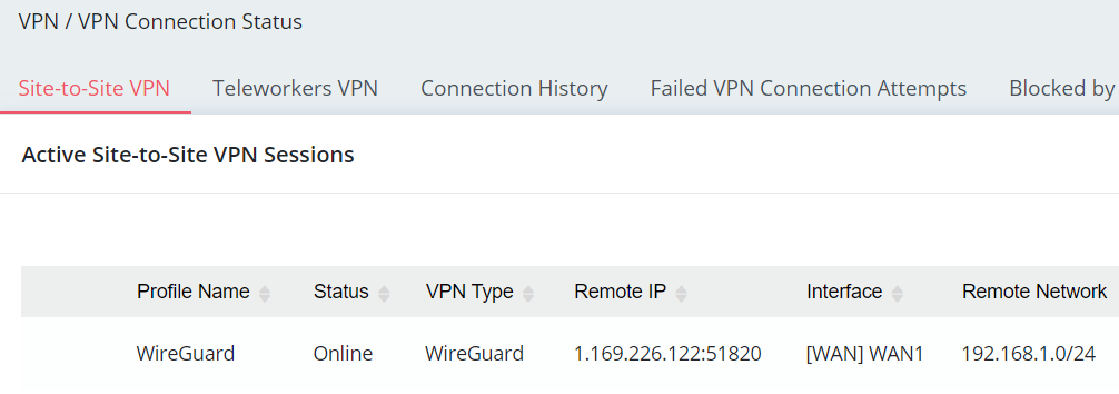 5.Vào VPN / VPN Connection Status kiểm tra kết nối WireGuard VPN LAN to LAN đã được thiết lập hay chưa.”